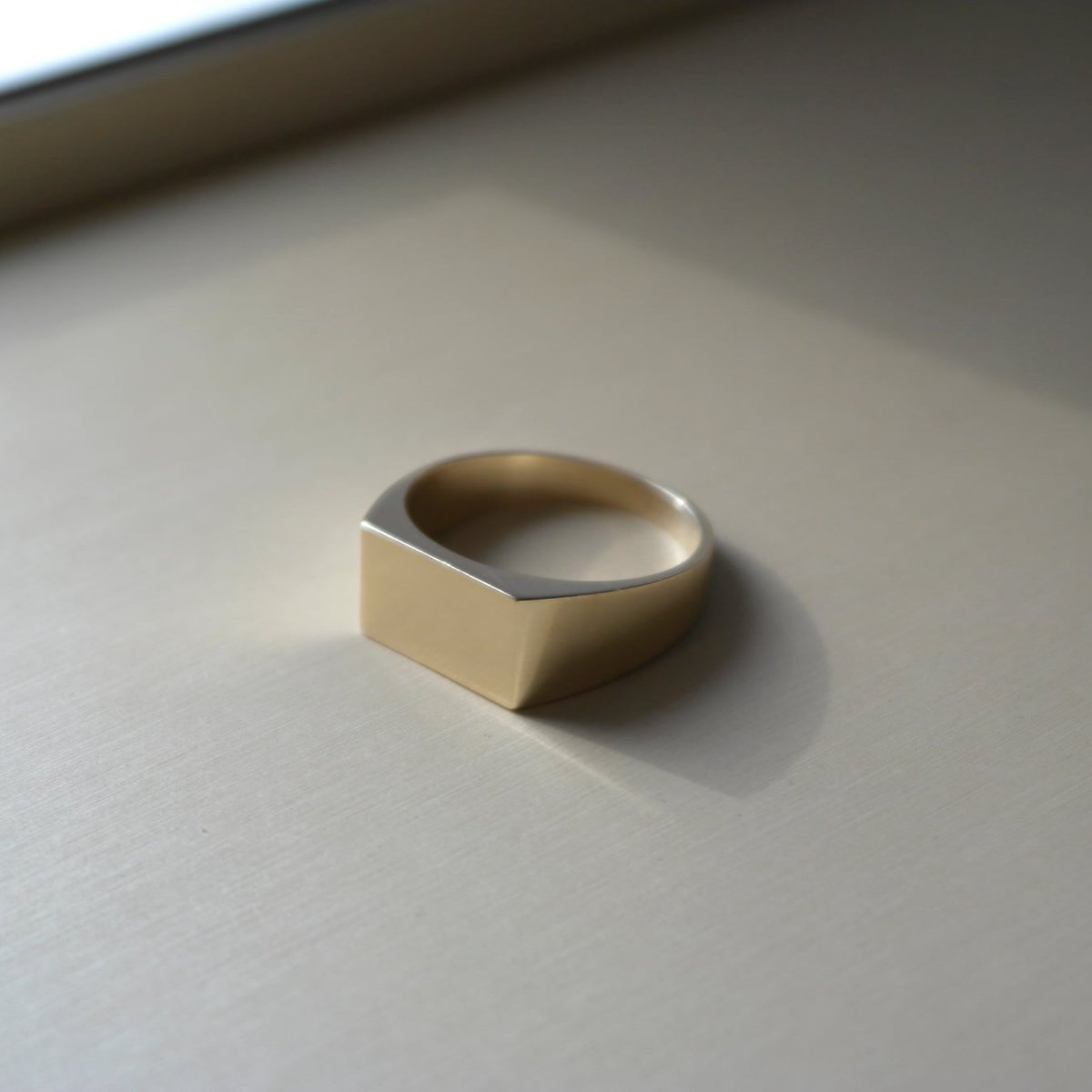 Klasyczny złoty sygnet z prostokątną tarczą, gładka polerowana powierzchnia